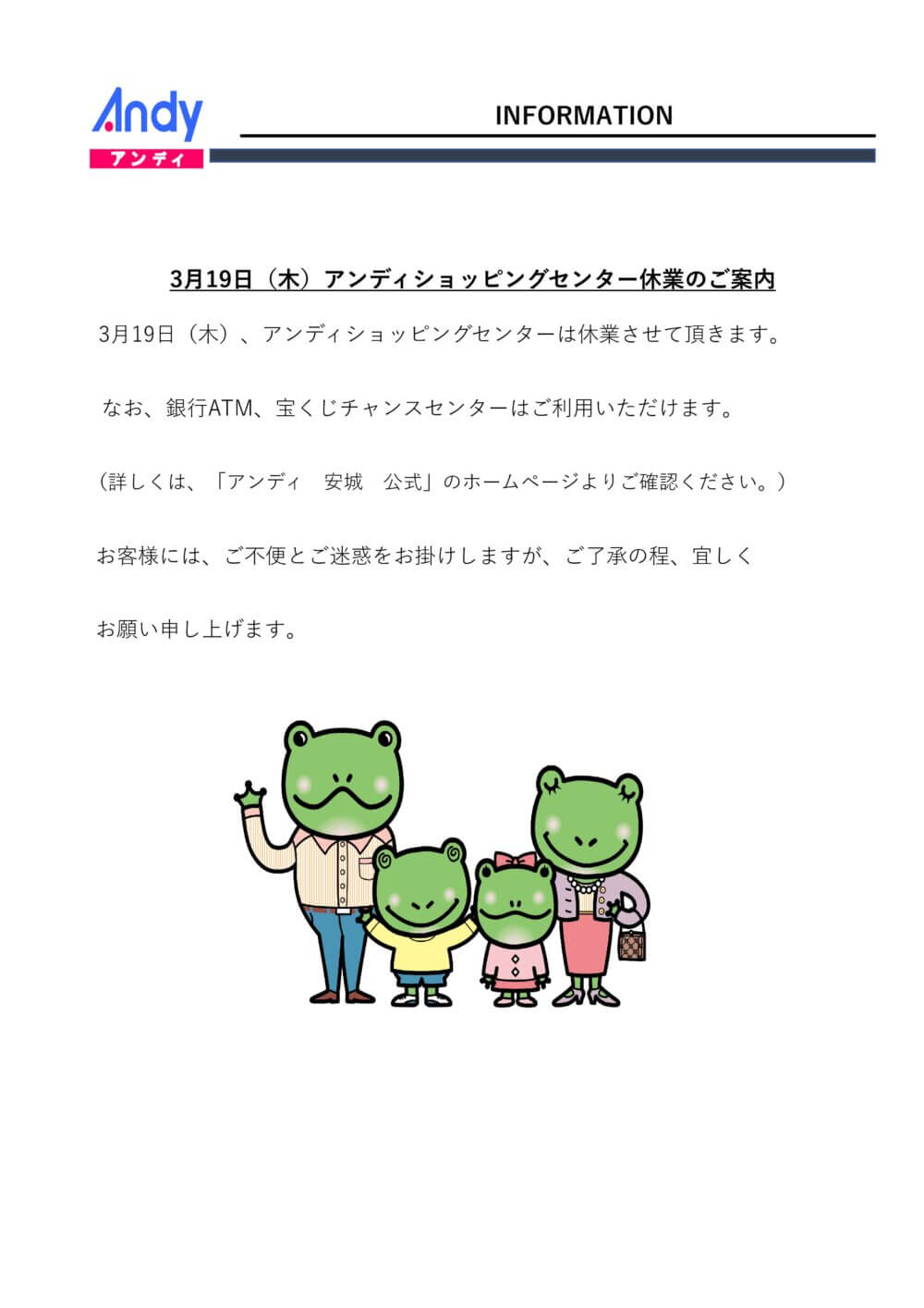 3月19日(木)アンディショッピングセンター休業のご案内